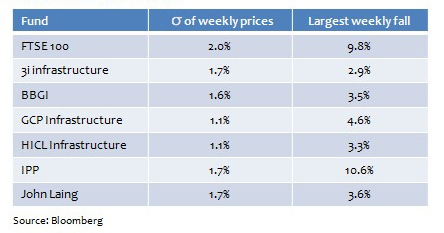 Equity betas of listed infrastructure funds are very low, which reflect the stable cash flows and low asset betas of the underlying projects. The analysis shows the volatility of fund share price returns relative to the FTSE 100.