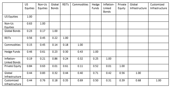 The correlations in Exhibit 1 are for infrastructure equity investments but the principle also holds true for infrastructure debt. See Equity betas for listed infrastructure funds, where we show that the betas between listed infrastructure debt funds and the broader equity market are very low at 0.079 on average and that almost all the of total risk of infrastructure is idiosyncratic risk and not market risk.