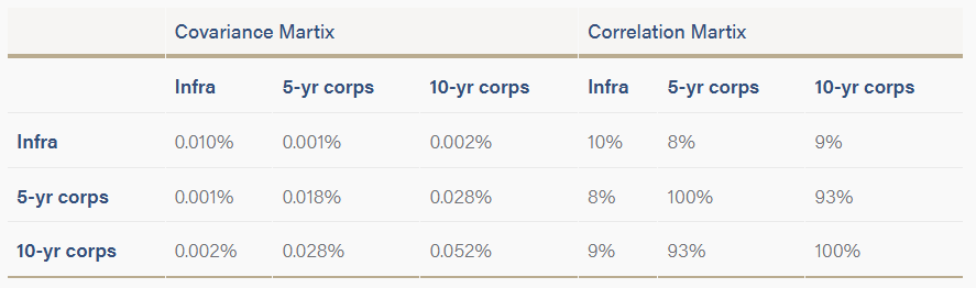 As can been seen, over the 6-year period, the mean performance of the three asset classes has been remarkably close but infrastructure debt has the lowest return volatility by a material measure. The table below shows the covariance and correlation matrices for the three asset classes: