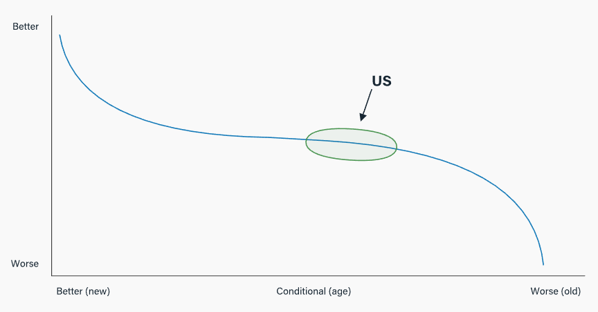 By most accounts, existing infrastructure condition is below average but stable O&M spending has maintained it. This would put its condition in the middle-right part of the horizontal x-axis in Exhibit 6. This high elasticity also helps explain why its age has been able to increase over the years without a corresponding drop in quality. It also shows that infrastructure condition can only worsen to a certain degree until quality drops off rapidly.